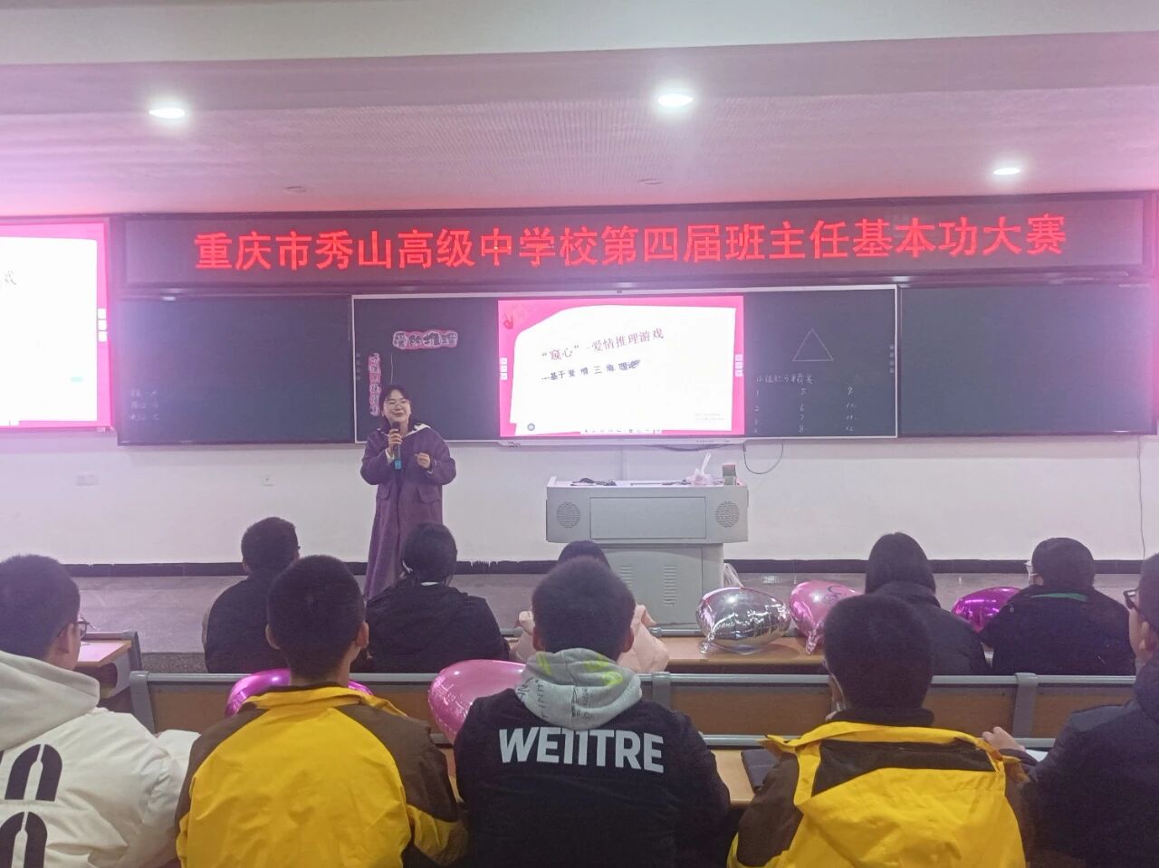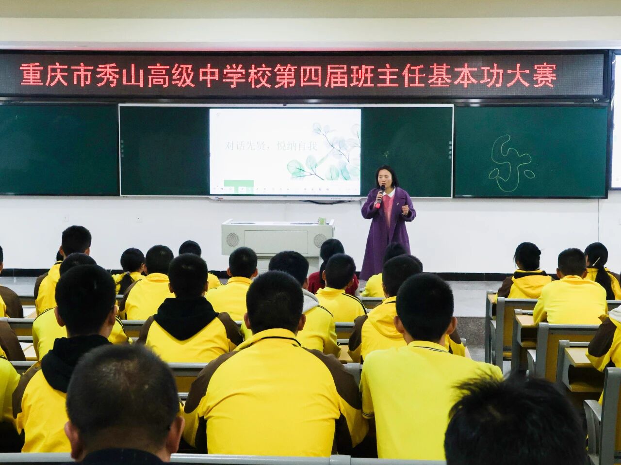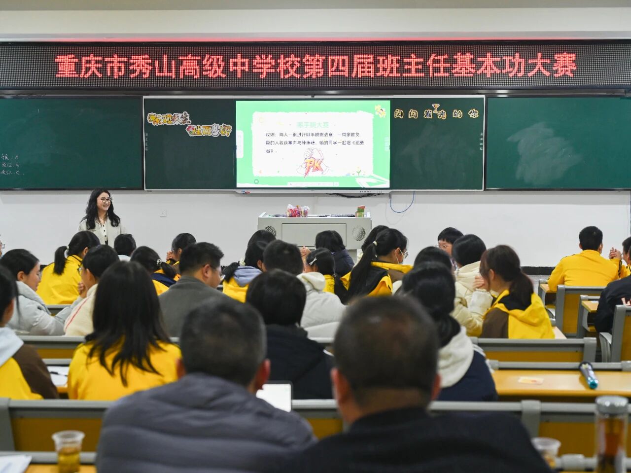 为深入贯彻落实习近平总书记关于教育的重要论述,切实落实立德树人根本任务,着力锻造一支政治素质过硬、育人能力精湛的班主任队伍,11月24日,我校第四届班主任基本功大赛在阶梯教室一成功举行。来自各年级的6位班主任代表同台竞技,呈现了6堂主题鲜明、内涵深刻的高质量主题班会课。我校副校长罗云东、德育处主任杨力、德育处副主任唐福玖出席活动。本次大赛由德育处副主任梁静主持,全校班主任及秀山县黄鹏程班主任工作室成员全程观摩。