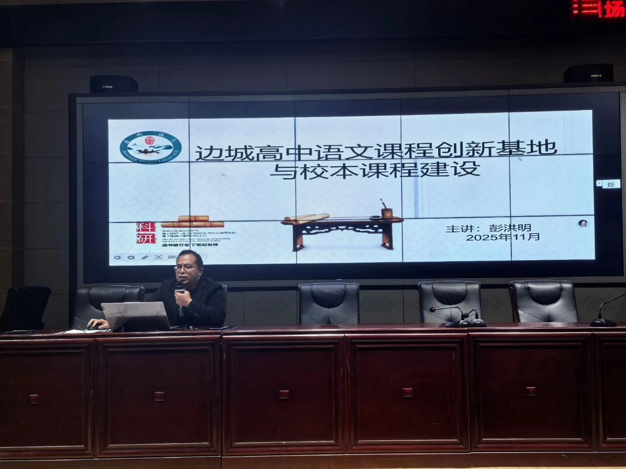 当天下午,彭洪明老师做了两场专题学术讲座——“基于课程标准的教学质量提升策略”“边城语文课程创新基地与校本课程建设”。彭洪明老师结合多年教学管理与课标实践经验,从教学目标精准定位、教学活动优化设计、多元评价体系构建等关键维度,分享了可落地、可复制的教学质量提升路径,为参会教师提供了兼具理论高度与实操价值的教学指引;彭老师还为与会嘉宾分享了近年来我校边城语文课程基地与语文校本课程建设情况及近期取得的成绩。