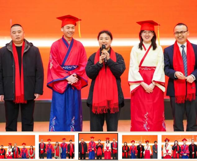 台上,12位家长代表俯身为孩子佩戴礼帽,指尖轻抚帽檐,目光里藏着说不尽的叮咛。台下,同学们互相别上徽章,相视一笑间,是彼此懂得的鼓励。一顶礼帽,接过父母的期许;一枚徽章,别上成人的担当。从此,少年加冠,大任始承。