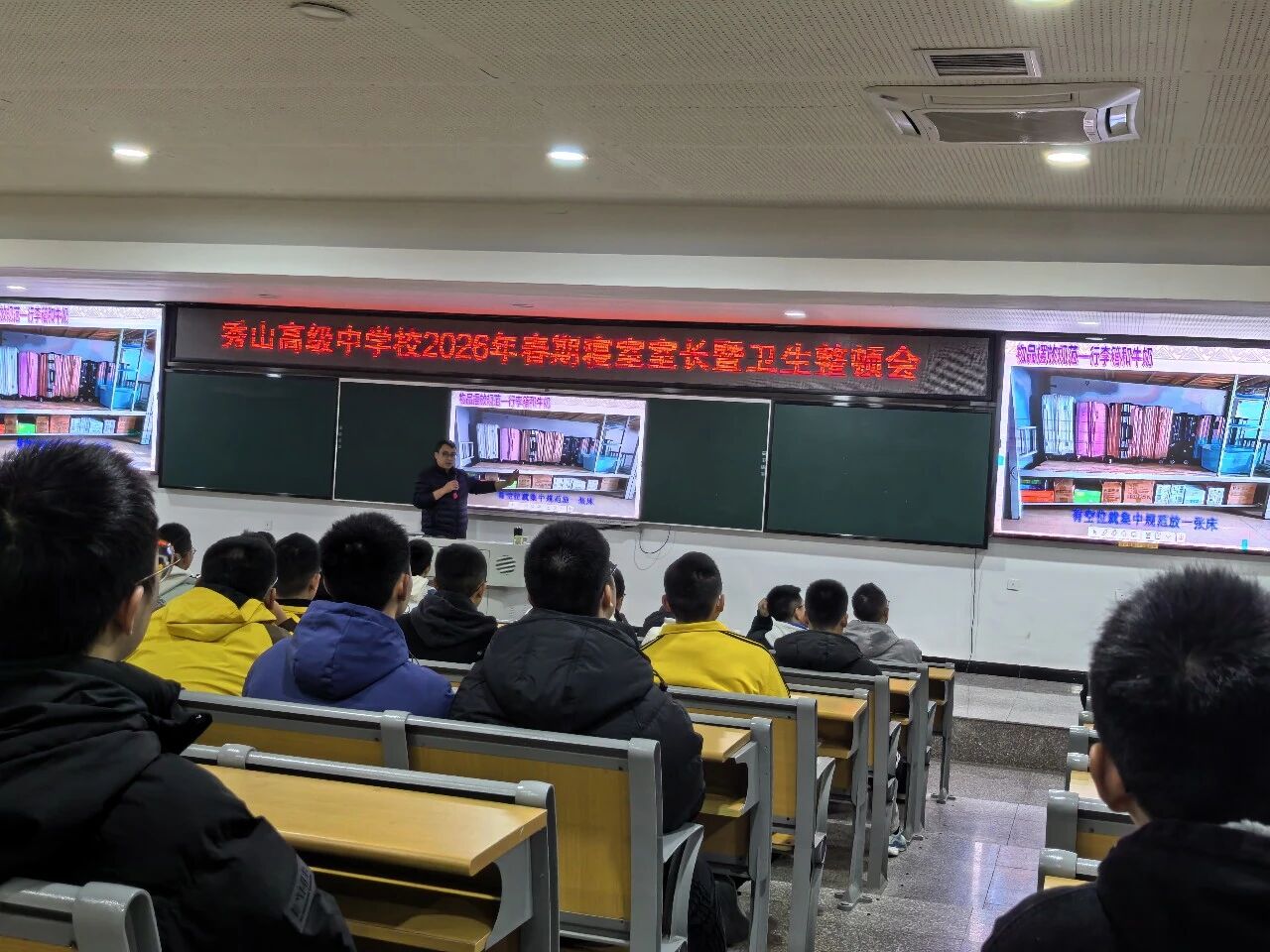 3月7日至8日,德育处以“用心做好寝室卫生,打造幸福寝居环境”为主题,分年级召开寝室室长卫生整顿会。唐福玖副主任通报开学以来寝室卫生检查中发现的问题,明确物品摆放、卫生清扫的具体标准及室长的管理职责,紧扣“青春·幸福”德育理念,引导室长带动全体室友共建干净、整洁、温馨的寝居环境,切实提升学生生活品质。杨力主任作总结发言,重点强调干净整洁的寝室环境对学生身心健康、学习效率的重要意义。