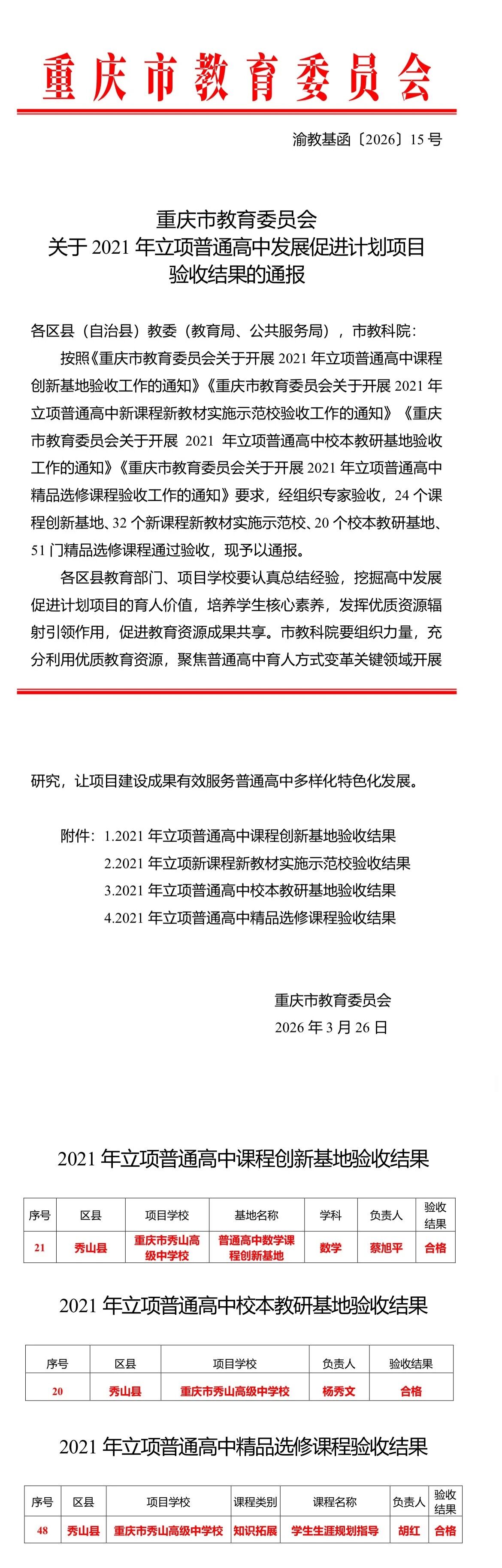 近日,重庆市教育委员会正式公布2021年立项的普通高中发展促进计划项目验收结果,我校申报的“普通高中数学课程创新基地”“普通高中校本教研基地”“‘学生生涯规划指导’精品选修课程”等三个市级项目,经过严格评审,全部顺利通过验收。