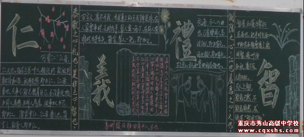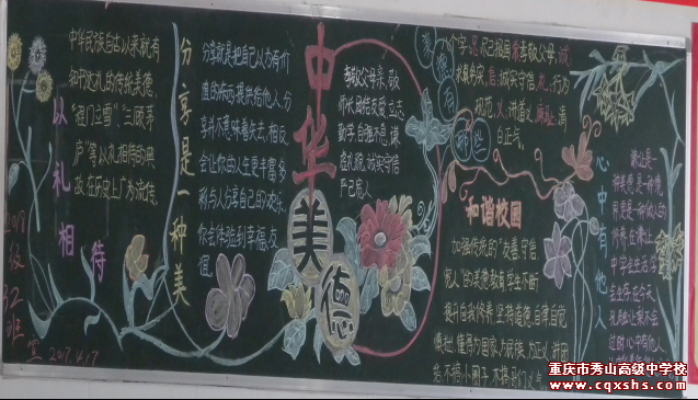 2017年4月,我校在高一高二年级68个班级中开展了“中华传统美德教育”黑板报评比活动,弘扬传统美德:忠、孝、诚、信、礼、义、廉、耻。忠:尽己报国的责任;孝:生生不息的爱心;诚:求真务实的品质;信:立身兴业的基点;礼:人际文明的规范;义:人间正道的向导;廉:清白正气的根基;耻:人之为人的底线。各班积极行动,黑板报主题明确,高2019级9班、12班和高2018级3班、10班、13班、32班6个班级获得了一等奖,高2019级、2018级的1班2班等27个班级获得了二等奖,达到了预期教育目的。