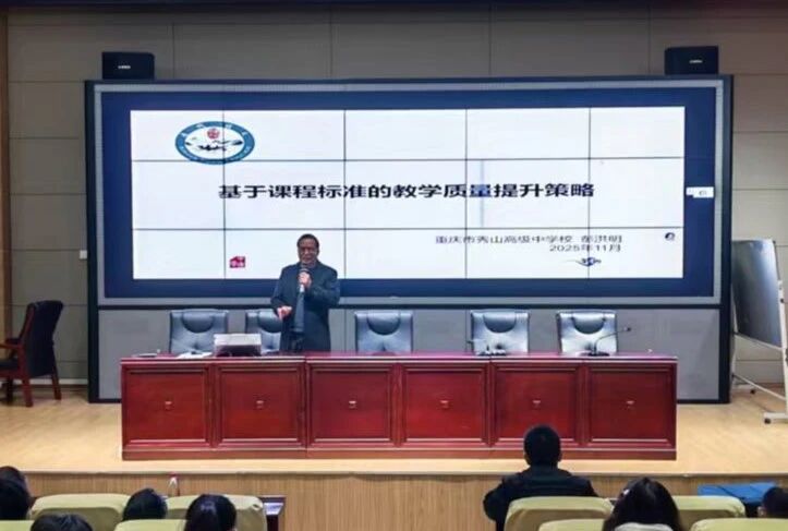 当天下午,彭洪明老师做了两场专题学术讲座——“基于课程标准的教学质量提升策略”“边城语文课程创新基地与校本课程建设”。彭洪明老师结合多年教学管理与课标实践经验,从教学目标精准定位、教学活动优化设计、多元评价体系构建等关键维度,分享了可落地、可复制的教学质量提升路径,为参会教师提供了兼具理论高度与实操价值的教学指引;彭老师还为与会嘉宾分享了近年来我校边城语文课程基地与语文校本课程建设情况及近期取得的成绩。